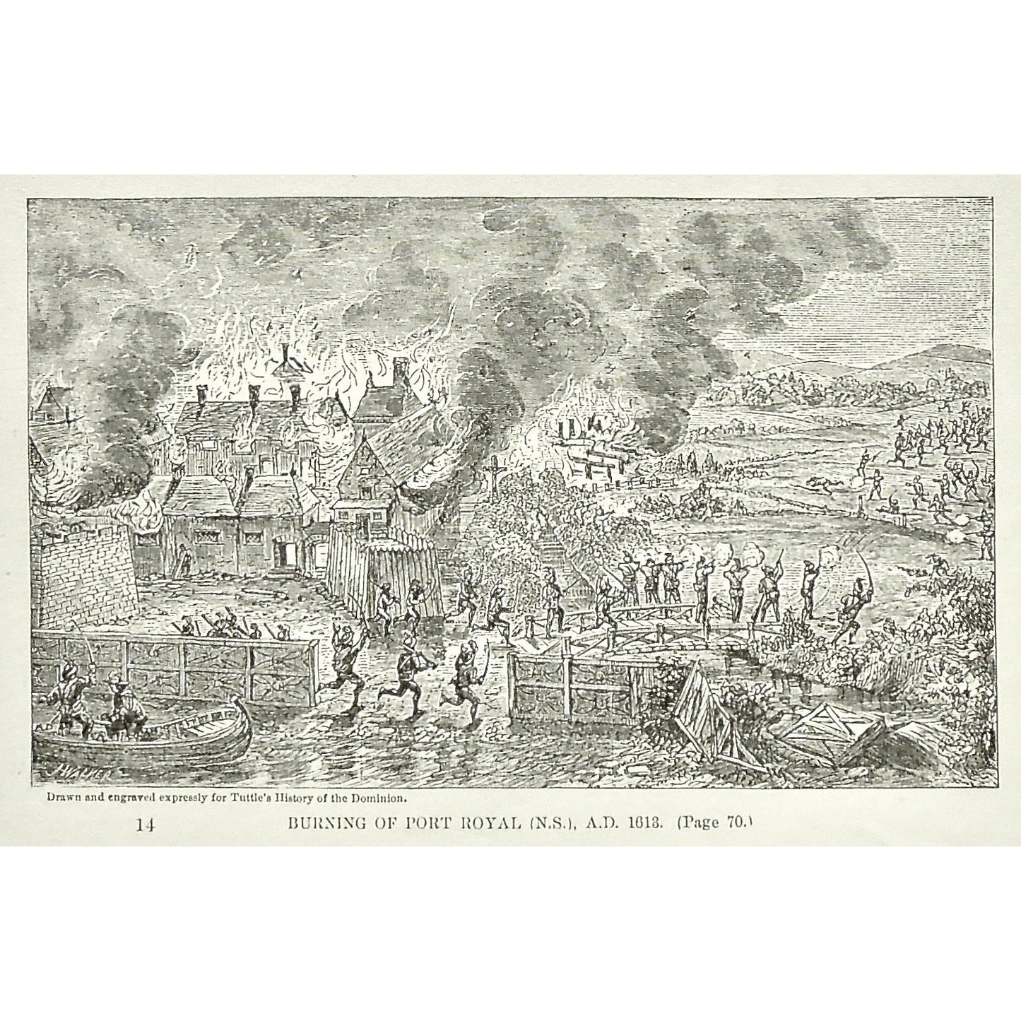 Keywords: Battle, Indians, Native, Natives, Burning of Port Royal, N.S., 1613, Burning, Port Royal, Nova Scotia, Battles, Soldiers, Troops, Bow and Arrow, Bows and Arrows, Weapons, Guns, War, Army, Formation, Tuttle, Charles Tuttle, History of the Dominion, Popular History of the Dominion, Downie, Bigney, History, Dominion, Canada, Canadian History, Antique, Antique Print, Steel Engraving, Engraving, Prints, Printmaking, Original, Rare prints, rare books, Wall decor, Home decor, office art, Unique, 1877,