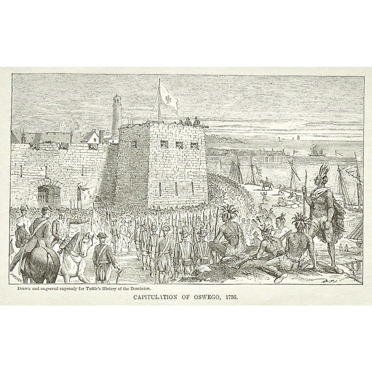 Keywords: Capitulation of Oswego, 1756, Capitulation, Oswego, Fort, Natives, Soldiers, Troops, Cavalry, Weapons, Guns, War, Army, Formation, Flag, Tuttle, Charles Tuttle, History of the Dominion, Popular History of the Dominion, Downie, Bigney, History, Dominion, Canada, Canadian History, Antique, Antique Print, Steel Engraving, Engraving, Prints, Printmaking, Original, Rare prints, rare books, Wall decor, Home decor, office art, Unique, 1877,