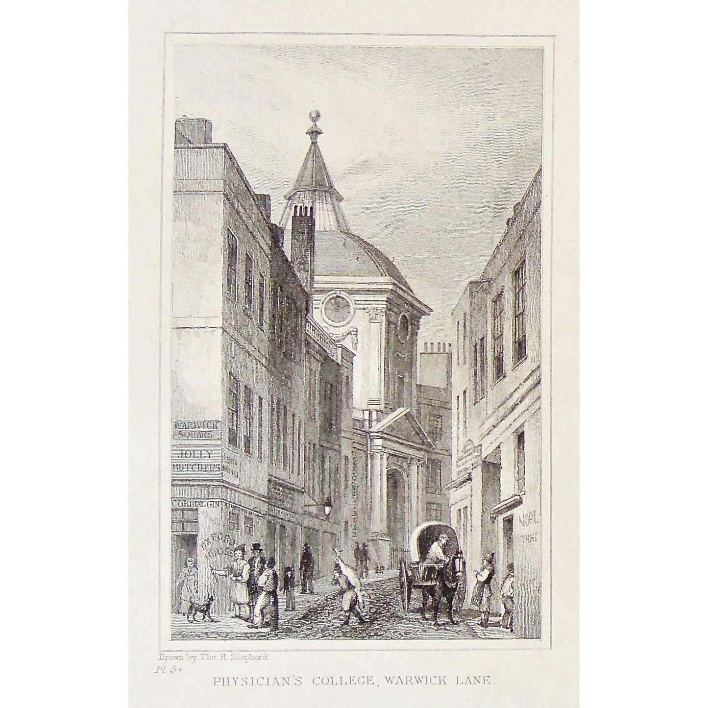 Keywords: Thomas Shepherd, Thos. Shepherd, Thomas Hosmer Shepherd, Shepherd, Jones & Co., Temple of the Muses, Finsbury Square, London, England, English, Old English, Metropolitain, Improvements, Nineteenth Century, 19th Century, Antique, Antiques, Antique Print, Antique Prints, Steel Engraving, Engraving, Print, Prints, Vintage, Original, Decor, Wall art, Art, History, Historical, Wall Decor, Design, Inspiration, British, Architecture, Building, People, Walking, Horse, Horse and carriage, Clothing, Attire, dress, hats, dogs, Warwick Square, Cordial Gin, Gin, Jolly Butcher, Butcher, Advertising on buildings, Advertising, Oxford House, Wagons, Barrels, Ornate, Door frame, Cobblestone Streets, Cobblestone, Physician’s College, Physician, College, Warwick Lane, Whittington's College, Whittington, College Hill, Herald's College, Herald's, Bennet's Hill, Bennet, Cornice, Pediment, Detailed, Steeple, Study, Academia, Students, Teachers, Street View,