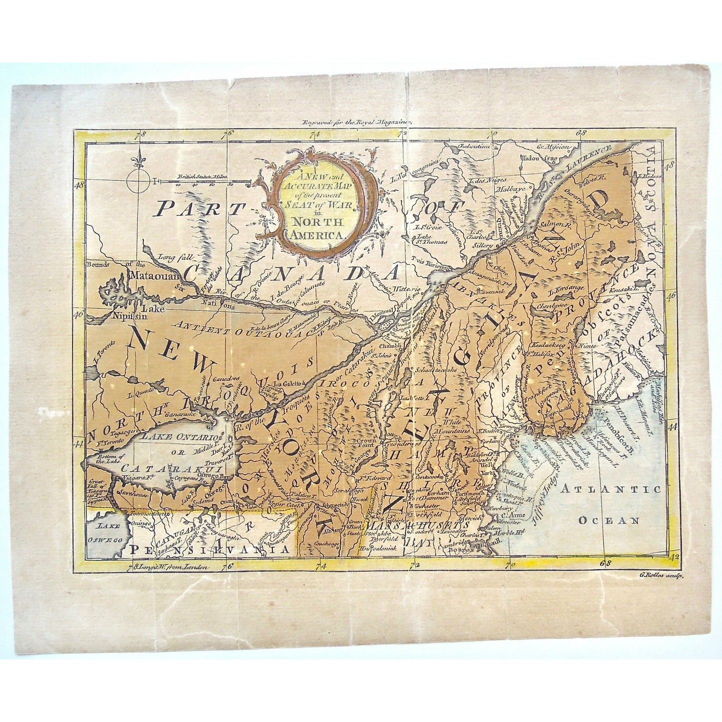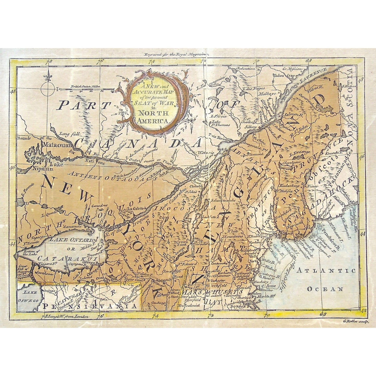 Keywords: New and Accurate Map, Seat of War, Seat of War in North America, Canada, New York, New England, Pennsylvania, Massachusetts Bay, New Hampshire, Lake Oswego, North Iroquois, Iroquois, Lake Ontario, Catarakui, Sagadahock, Pen. od Scots, Province of Sagadahock, Nova Scotia, St. Lawrence River, Ancient Outaouacs, Irocos, Mohawk, Mohawks, Oneydoes, Lake Nipissin, Mataouan, Catarakui, Abnakies, Cayugaes, Jeffrey's Ledge, Province of Main, Maine, Passamacadies, Map, Maps, Mapping, Chart, Charts, Charting, Rollos, Royal Magazine, Antique Print, Antique Map, Antique, Vintage, Rare, Rare Map, Collector, Unique, Original, Copper engraving, Engraving,