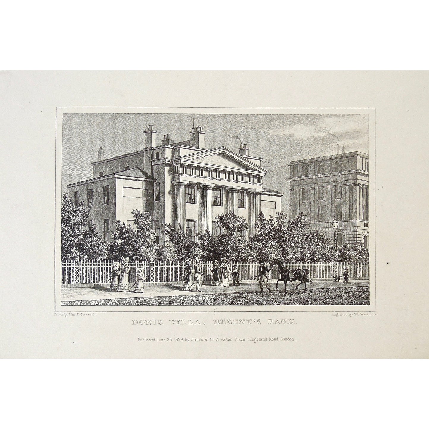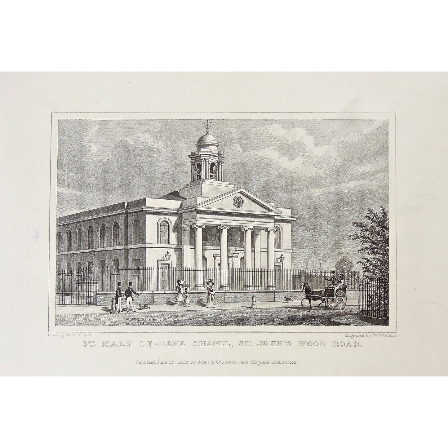 Keywords: Thomas Shepherd, Thos. Shepherd, Thomas Hosmer Shepherd, Shepherd, Jones & Co., Temple of the Muses, Finsbury Square, London, England, English, Old English, Metropolitain, Improvements, Nineteenth Century, 19th Century, Antique, Antiques, Antique Print, Antique Prints, Steel Engraving, Engraving, Print, Prints, Vintage, Original, Decor, Wall art, Art, History, Historical, Wall Decor, Design, Inspiration, St. Mary Le-Bone Chapel, St. Mary, Le-Bon, Chapel, Building, Architecture, Pillars, Columns, Gates, People, Walking, Daily life, St. John's Wood Road, Doric Villa, Doric, Villa, Regent's Park, Horse, Clothing, dress, Hats, Horse and carriage, Cornice, Pediment, Ornate, Detailed, Gate, Cupola, W. Watkins, People, Walking, dogs, Men, Women, Children, Street View, Buildings,