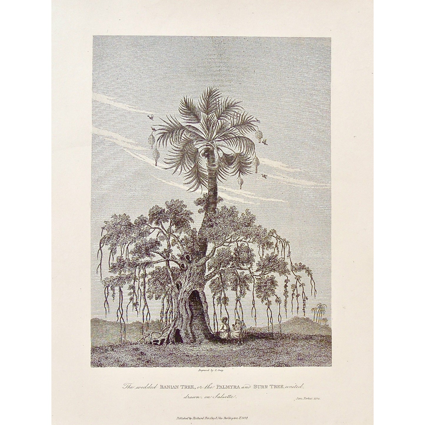 Keywords: Wedded Banian Tree, Banian Tree, Tree, Trees, Banian, Banyan, Banyan Tree, Wedded Banyan Tree, Palmyra, Burr Tree, Palmyra and Burr Tree United, Botany, drawn on Salsette, Salsette, Under a banian tree, under a tree, Sitting under a tree, India, Indian, Indian Tree, Indian landscape, James Forbes, Forbes, Eliza Rosée, Countess De Montalembert, Oriental Memoirs, Narrative of Seventeen Years Residence in India, Bentley, 8 New Burlington Street, London, Greig, Nichols & Son, 25 Parliament Street, 1774, 1834, Steel engraving,